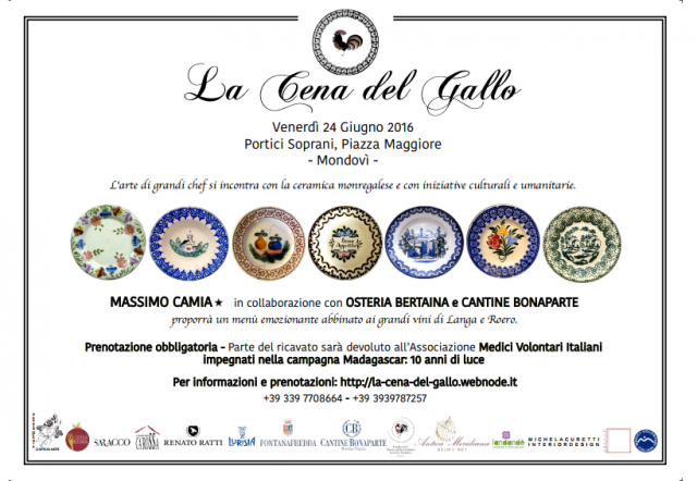 21.00 Cena conviviale ideata da Angioletta De Giorgis dell’Antica Meridiana relais art con la collaborazione dello Studio Michela Curetti Interior Design, a cura degli Chef Massimo Camia del Ristorante Massimo Camia di La Morra, Antonio Costamagna delle Cantine Bonaparte di Mondovi, Claudio Manoni dell’Osteria Bertaina di Mondovi in abbinamento ai grandi vini di Langa e Roero forniti dalle Cantine Fontanafredda di Serralunga d’Alba, Cascina Ca’ Rossa di Canale, Renato Ratti di La Morra, Paolo Saracco di Castiglione Tinella e acqua minerale delle fonti di Lurisia, sotto i suggestivi archi dei Portici Soprani che si affacciano sulla Piazza Maggiore di Mondovì.